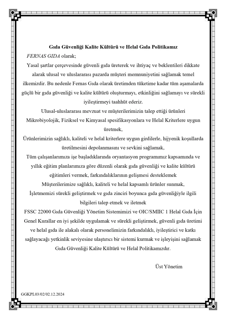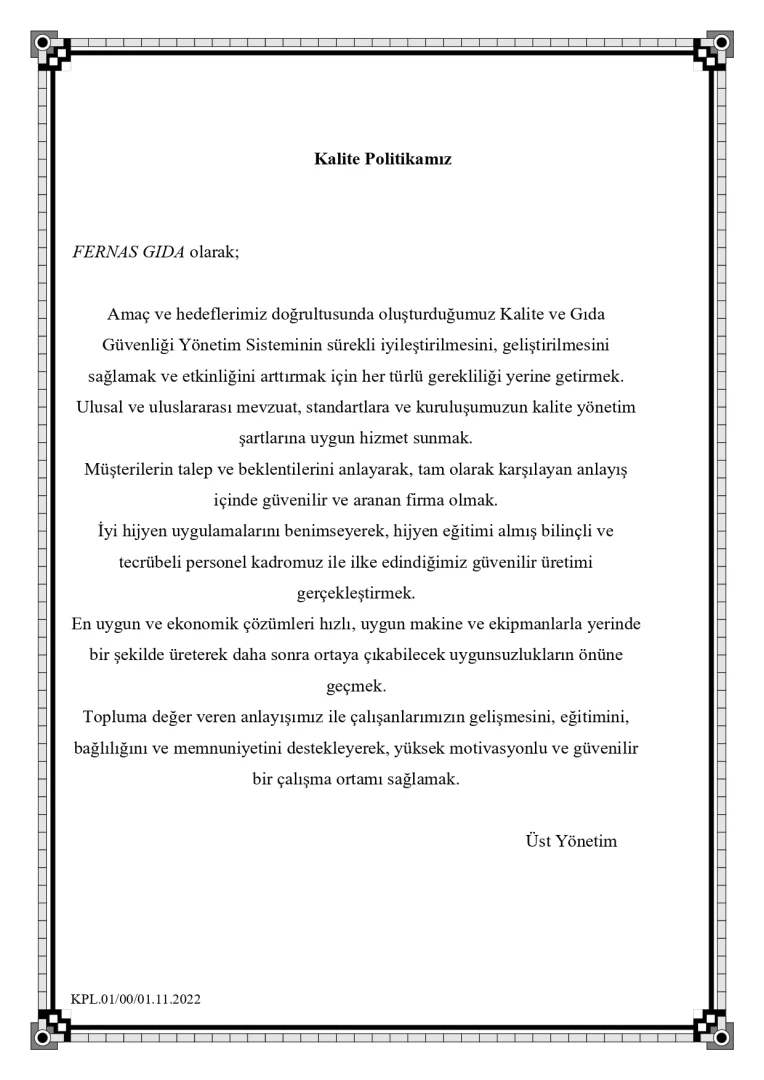 GIDA GÜVENLİĞİ ve KALİTE POLİTİKAMIZ